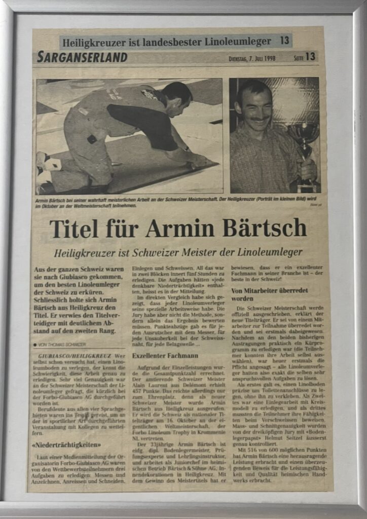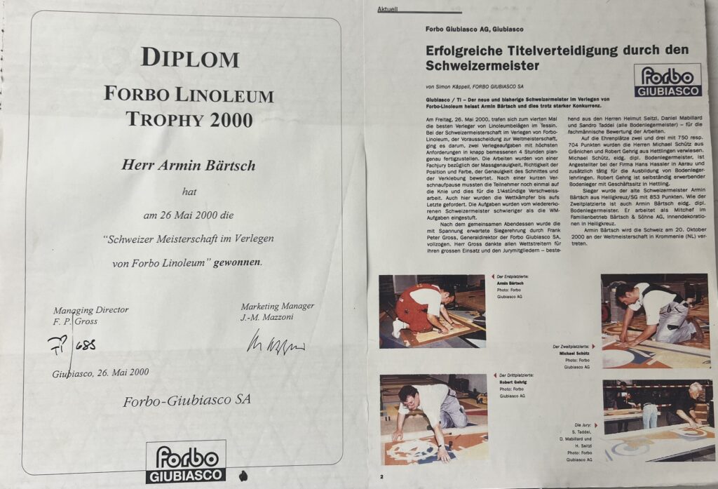 Armin Bärtsch Gewinnt die Schweizermeisterschaft im Linoleum verlegen.